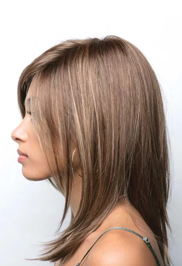 Peruca Laine de cabelo sintético da coleção René of Paris,cabelo liso, repartido de um lado e tampado na frente.