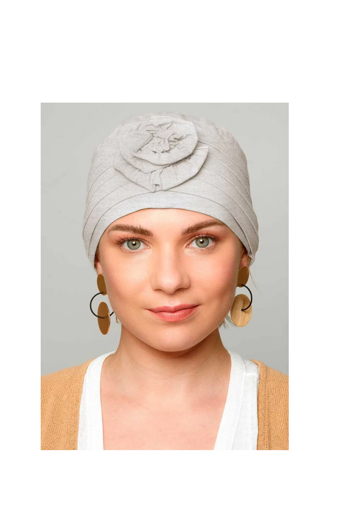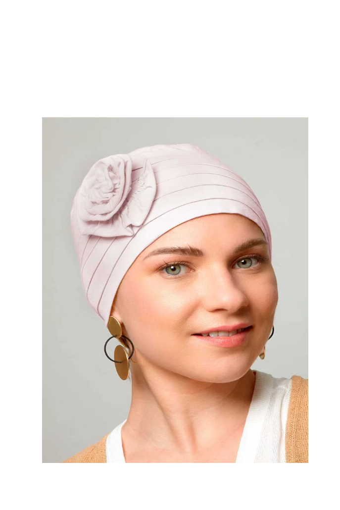 O seu design plissado com a aplicaçao de uma flor permite um ajusto perfeito e confortável na cabeça.