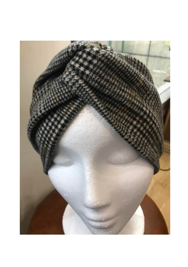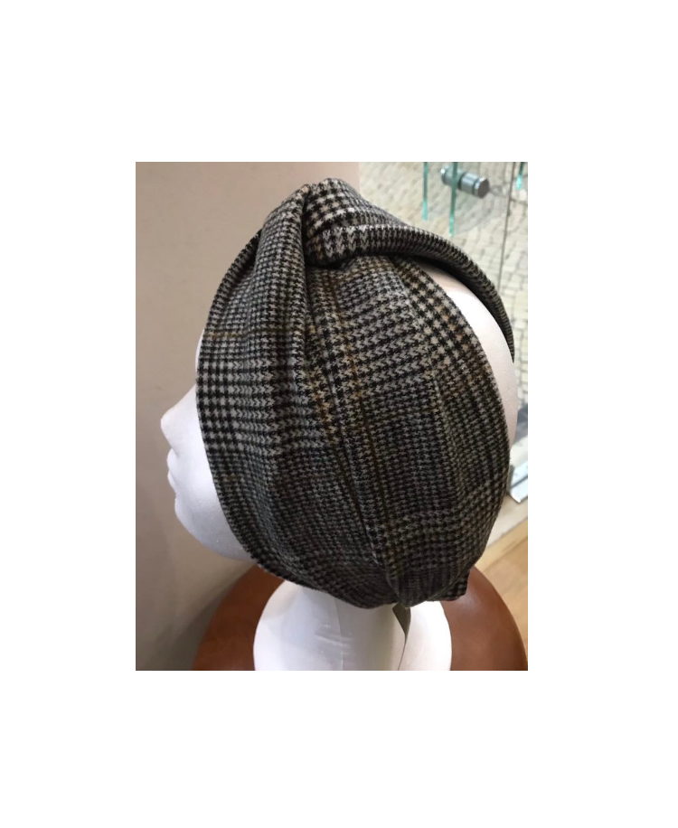 Turbante de fita em lã com detalha de pregas na frente.